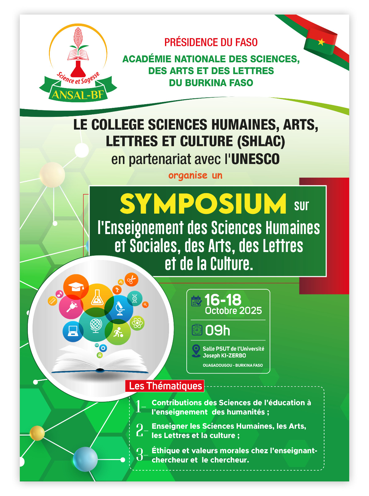 Le Collège Sciences Humaines, Arts, Lettres et Culture (SHLAC) en partenariat avec l’UNESCO organise un du 16 au 18 octobre 2025 dans la salle PSUT de l’UJKZ. Vous êtes invités à ces trois jours d’échanges et de partages.